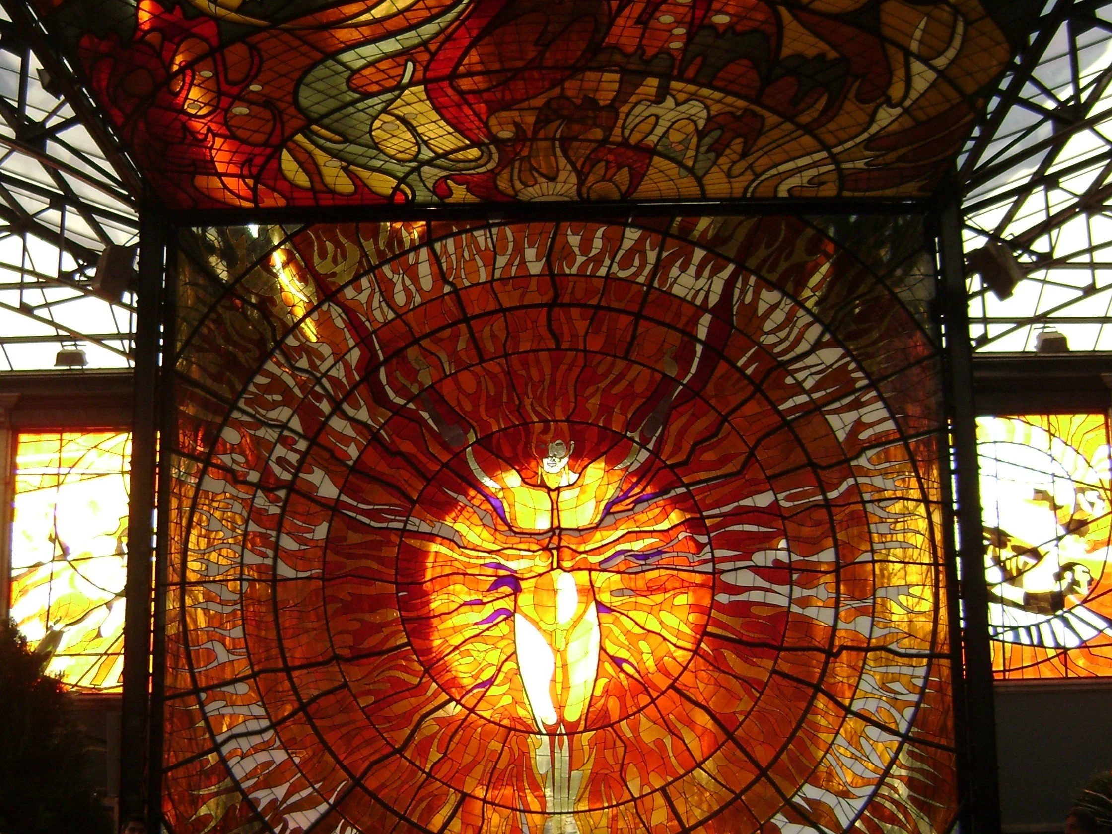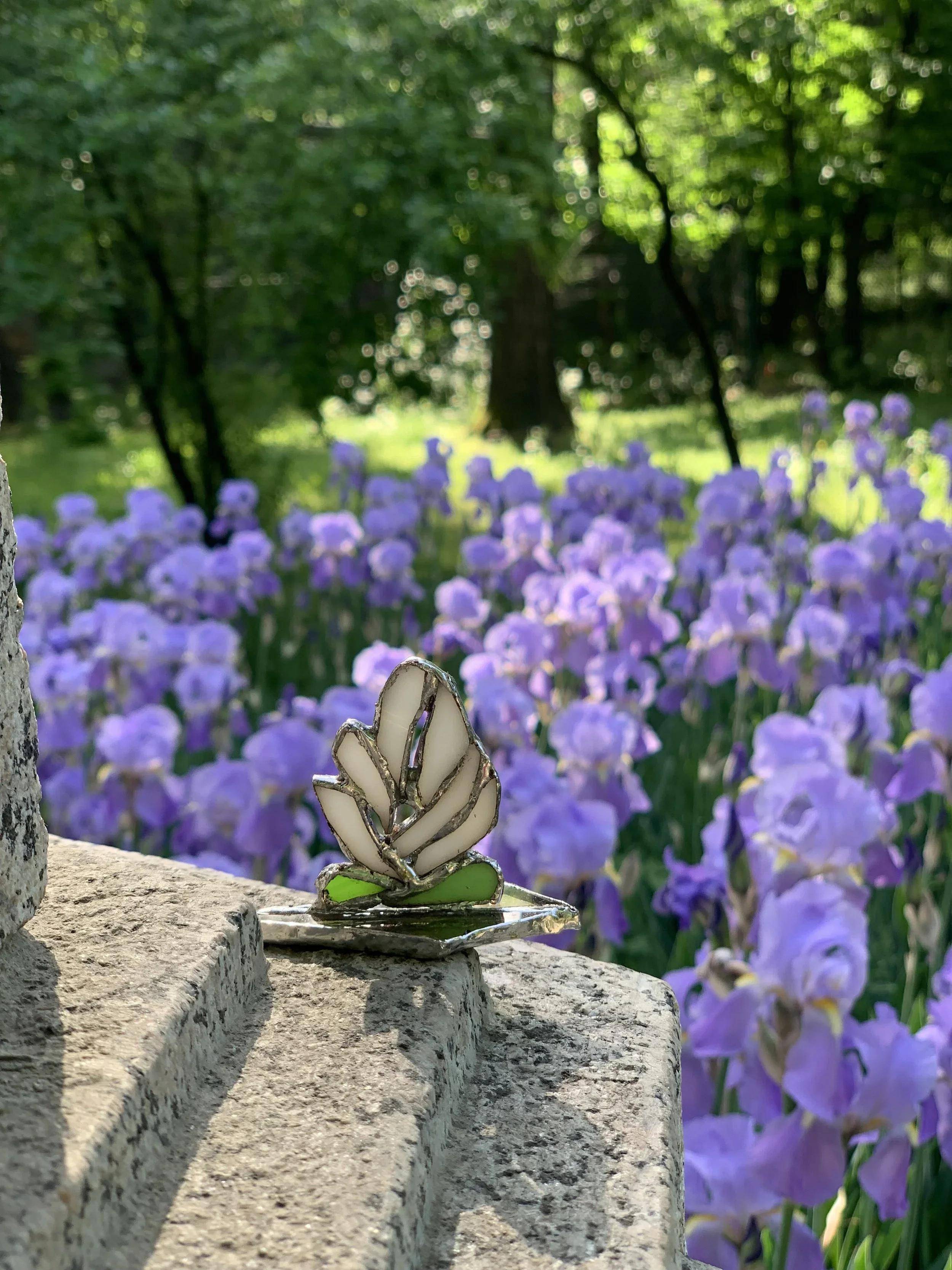 Close-up of a stained glass piece of art with metal accents in a garden, with a blurred clock tower and pink flowers in the background.