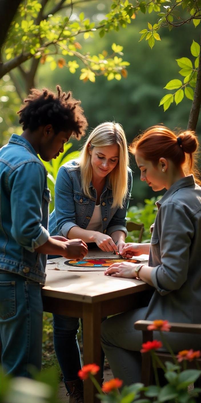 Three people, a woman and two young women, are gathered around a wooden table outdoors, engaged in a craft activity with colorful glass. They are surrounded by lush green foliage and sunlight filtering through the trees.