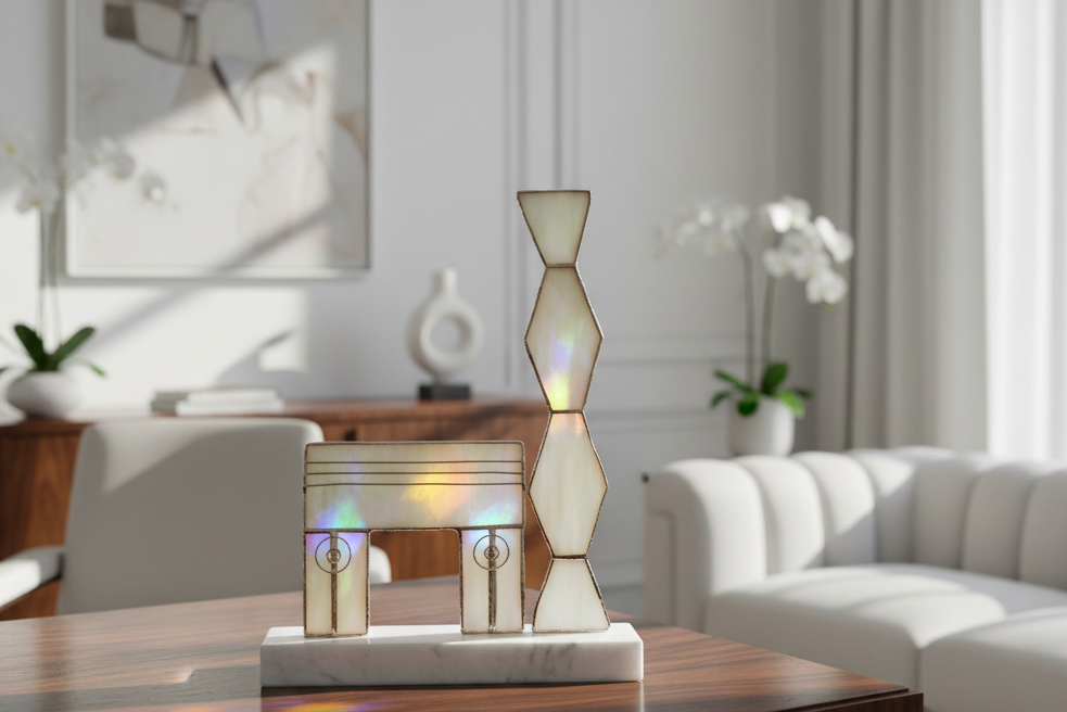 Within the refined universe of Marie Art Gallery, “Embrace” unfolds as a quiet dialogue between form, light, and stillness. Crafted in stained glass, the piece transcends its decorative function, becoming a contemplative meditation on connection—between matter and spirit, between grounding and ascent.